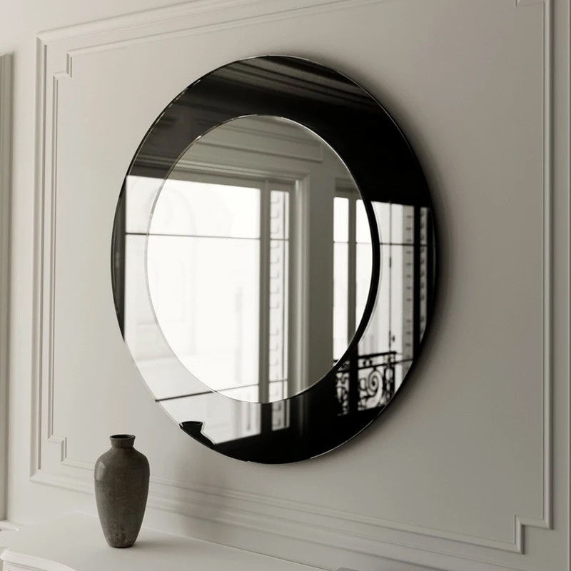 آینه دکوراتیو دوبل ۲ رنگ عکسنگ – دایره سایز 70 سانتی متر آینه های دورنگ زیبا به یکدیگر بصورت دایره شکل با قطر ۷۰ سانت و ۵۰ سانت متصل شده اند. این آینه ها بدلیل دو تکه بودن هم از استحکام بهتر و مقاوم تری برخوردار هستند و هم بدلیل اختلاف زاویه در انعکاس نور و تصویر زیبایی خاصی بصورت فریم به آینه میدهد.