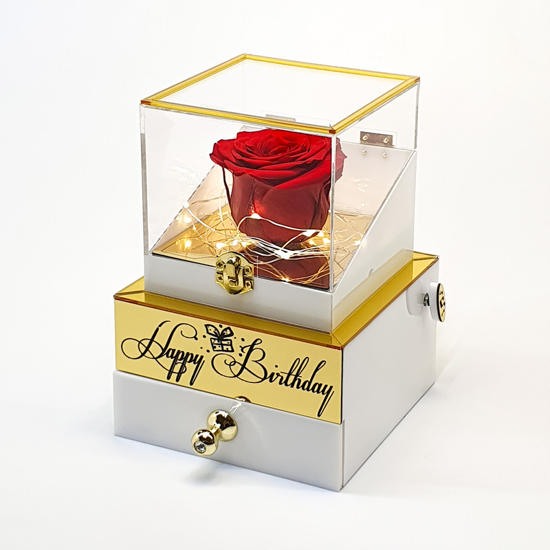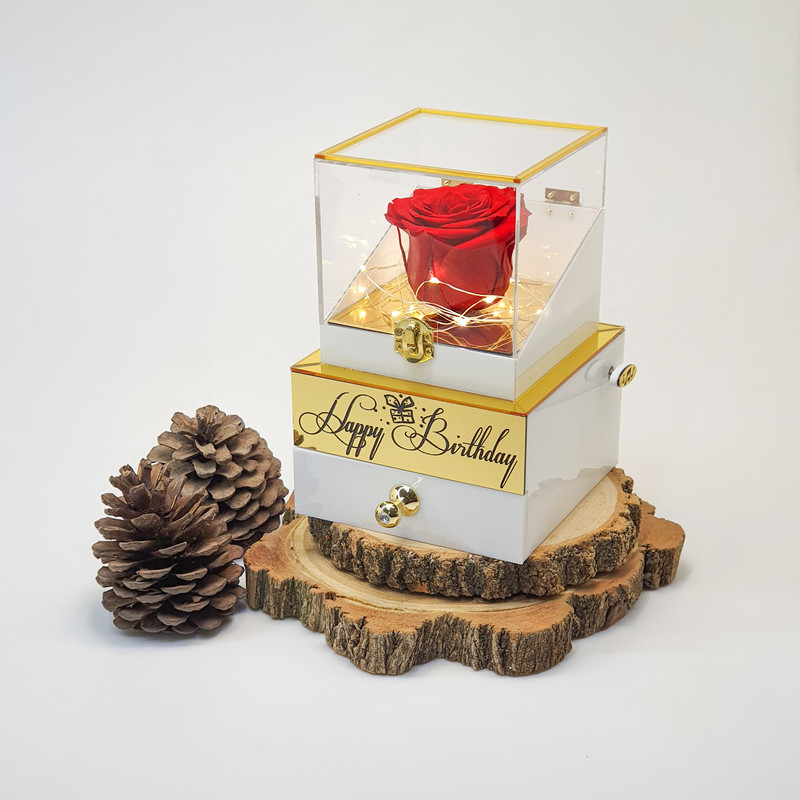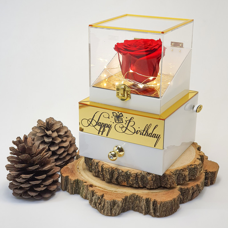 متریال این جعبه گل رز جاودان از جنس پلکسی میباشد، قسمت بالا جنس از پلکسی شفاف و در قسمت پایین از پلکسی به رنگ سفید است. این جعبه در قسمت پایین دارای یک کشو برای قرار دادن هدایای کوچک مثل ساعت، سکه، پول، قطعه ای طلا و… مناسب بوده و همچنین ما سعی کردیم از دستگیره ای برای این کشو استفاده کنیم که نمای دوچندانی به کلیت جعبه بدهد. قسمت بالایی باکس بصورت صندوقی میباشد و این امکان رو به صاحب جعبه میدهد که در هر زمان قفل صندوق رو باز کرده و بدون قسمت محافظ از دیدن گل رز جاودان لذت ببرد.