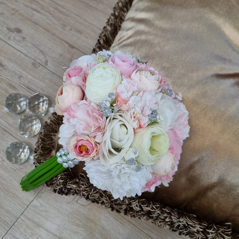 دسته گل عروس شامل گل رز ، پیونی ، داوودی با ترکیب رنگ صورتی مناسب برای نامزدی ، عقد و عروسی ، قسمت ساقه دسته گل با ریسه مراورید دیزاین شده و ارتفاع دسته گل ۳۰ سانت و قطر گردی آن ۲۳سانت است.