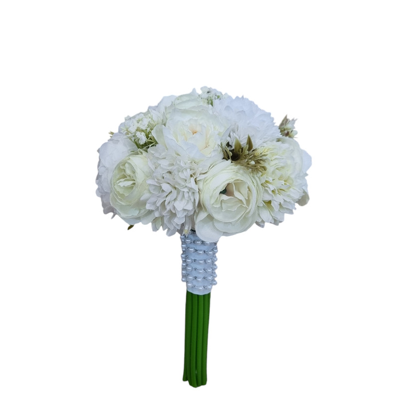 دسته گل مصنوعی عروس مدل پیونی از گل های پیونی ریز و درشت و گل داوودی تشکیل شده ، قسمت ساقه گل ها با ربان و مروارید تزئین شده که زیبایی کار را دوچندان میکند.