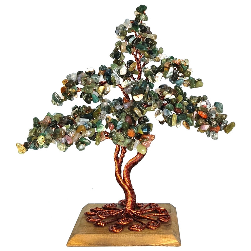 درختچه سنگی عقیق سبز خزه ای ساخته شده از سنگ های طبیعی و نامنظم عقیق و سیم مسی .