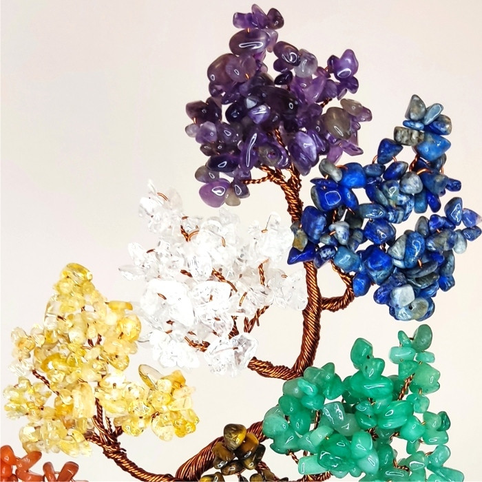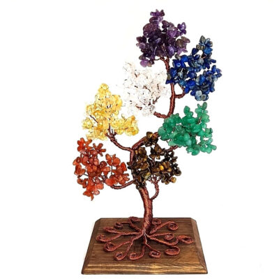 ساخته شده با سنگ های طبیعی و نامنظم آمیتیست بنفش، لاجورد، کوارتز شفاف، آونتورین سبز، سیترین زرد، چشم ببر قهوه ای و عقیق قرمز . یک درختچه سرشار از انرژی و آرامبخش .در ادامه خواص این درختچه ذکر شده است .