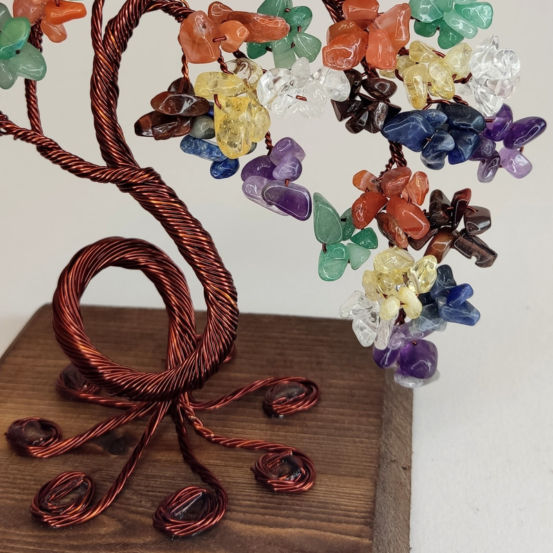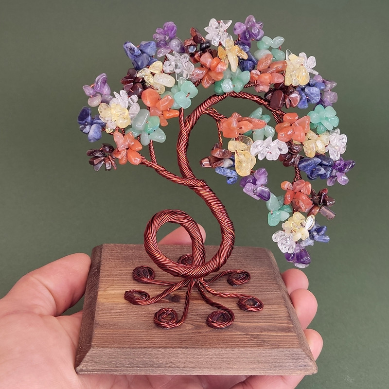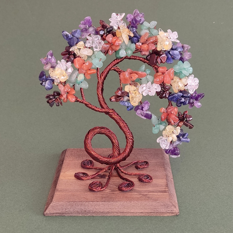 درختچه سنگی هفت چاکرا کد ۱۹۶ ساخته شده با سنگ های طبیعی و نامنظم آمیتیست بنفش، سودالیت سرمه ای، کوارتز شفاف ،آونتورین سبز، سیترین زرد، چشم ببر تیره و عقیق قرمز . یک درختچه سرشار از انرژی و آرامبخش .در ادامه خواص این درختچه ذکر شده است