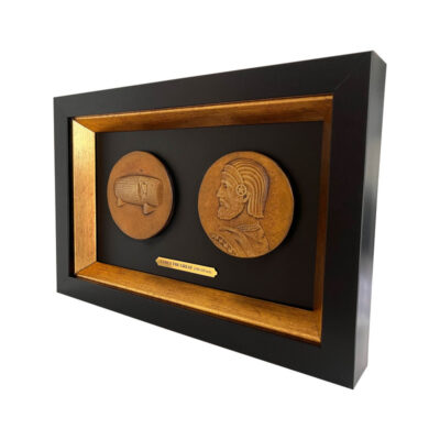مزین به دو سکه با نمادهای سردیس و منشور کورش کبیر از جنس فلز برنج با قطر 10 سانتی متر و وزن تقریبی 0.6 کیلوگرم، دارای شناسنامه اثر در قسمت پشت تابلو
