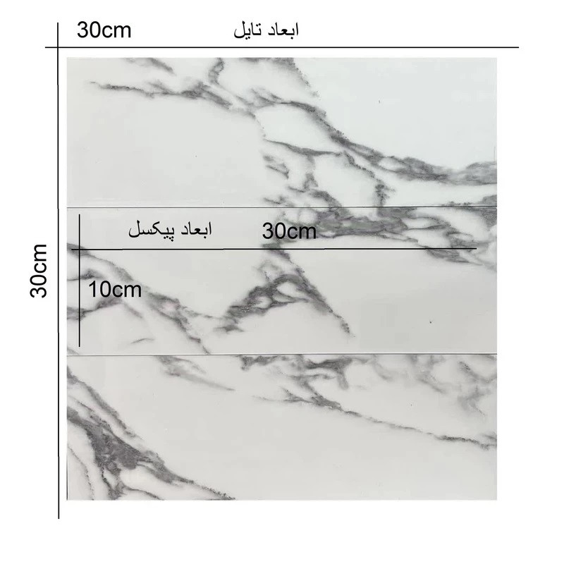 ابعاد و محاسبه مقدار مورد نیاز: این محصول شامل 6 عدد تایل 30 در 30 سانتی متر یا همان 0.6 متر مربع است و پیکسل این محصول 10 در 30 سانتی متر است برای به دست آوردن متراژ دقیق طول را در ارتفاع مورد نیازتان ضرب کنید تا مترمربع را به دست آورید رنگ: رنگ محصول کاملا همانند تصویر آن میباشد و رنگ دقیق پیکسل ها سنگ مرمر سفید با رگه خاکستری و سنگ مرمر مشکی با رگه های سفید است. قدرت چسبندگی و استفاده: تایل بین کابینتی کامپوزیت ماربل پشت چسبدار این محصول مخصوص استفاده برای بین کابینت و دیوار سرویس بهداشتی و آشپزخانه و… استفاده میشود. و جنس چسب این محصول آلمانی میباشد و از قدرت چسبندگی بسیار بالا و با دوام برخوردار است. مقاومت و تمیز کاری: بر اثر حرارت های پشت بخاری یا گاز آشپزخانه و…. کاملا ایمن و مقاوم است و همچنین قابلیت نظافت آسان دارد.