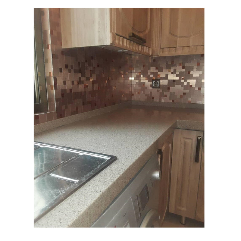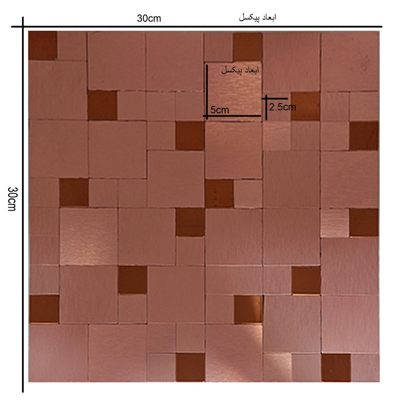 ابعاد و محاسبه مقدار مورد نیاز: مدل این محصول پازلی است و این محصول شامل 6 عدد تایل 30 در 30 سانتی متر یا همان 0.6 متر مربع است و پیکسل این محصول 2.5 در 2.5 و 5 در 5 سانتی متر است برای به دست آوردن متراژ دقیق طول را در ارتفاع آن ضرب کنید تا مترمربع را به دست آورید رنگ: رنگ محصول کاملا همانند تصویر آن میباشد. رنگ پیکسل ها شامل رزگلد خشدار و آینه ای است قدرت چسبندگی و استفاده: تایل بین کابینتی کامپوزیت آلمینیومی پشت چسبدار این محصول مخصوص استفاده برای بین کابینت و دیوار سرویس بهداشتی و آشپزخانه و… استفاده میشود. و جنس چسب این محصول آلمانی میباشد و از قدرت چسبندگی بسیار بالا و با دوام برخوردار است. مقاومت و تمیز کاری: بر اثر حرارت های پشت بخاری یا گاز آشپزخانه و…. کاملا ایمن و مقاوم است و همچنین قابلیت نظافت آسان دارد