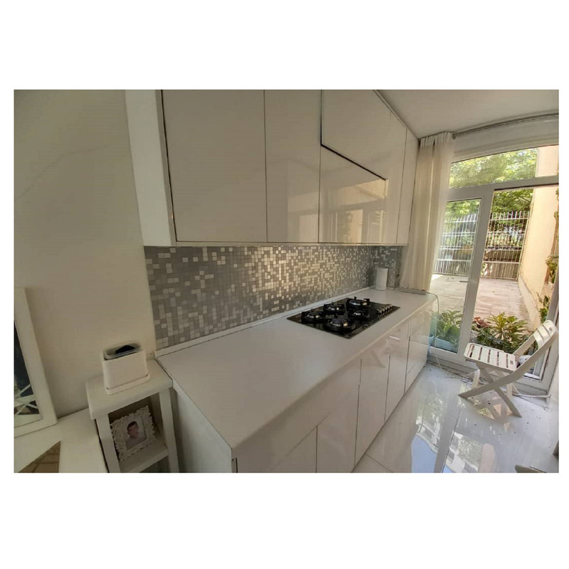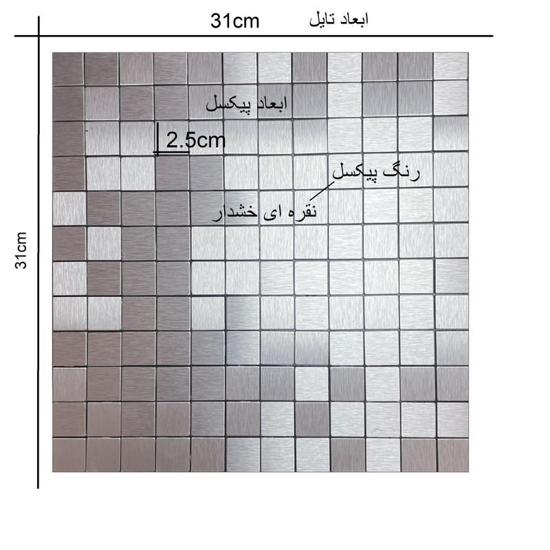 ابعاد و محاسبه مقدار مورد نیاز: مدل این محصول پازلی است و این محصول شامل 11 عدد تایل 31 در 31 سانتی متر یا همان 1 متر مربع است و پیکسل این محصول 2.5 در 2.5 سانتی متر است برای به دست آوردن متراژ دقیق طول را در ارتفاع آن ضرب کنید تا مترمربع را به دست آورید رنگ: رنگ محصول کاملا همانند تصویر آن میباشد. رنگ دقیق پیکسل ها نقره ای خشدار است قدرت چسبندگی و استفاده: تایل بین کابینتی کامپوزیت آلمینیومی پشت چسبدار این محصول مخصوص استفاده برای بین کابینت و دیوار سرویس بهداشتی و آشپزخانه و… استفاده میشود. و جنس چسب این محصول آلمانی میباشد و از قدرت چسبندگی بسیار بالا و با دوام برخوردار است. مقاومت و تمیز کاری: بر اثر حرارت های پشت بخاری یا گاز آشپزخانه و…. کاملا ایمن و مقاوم است و همچنین قابلیت نظافت آسان دارد.