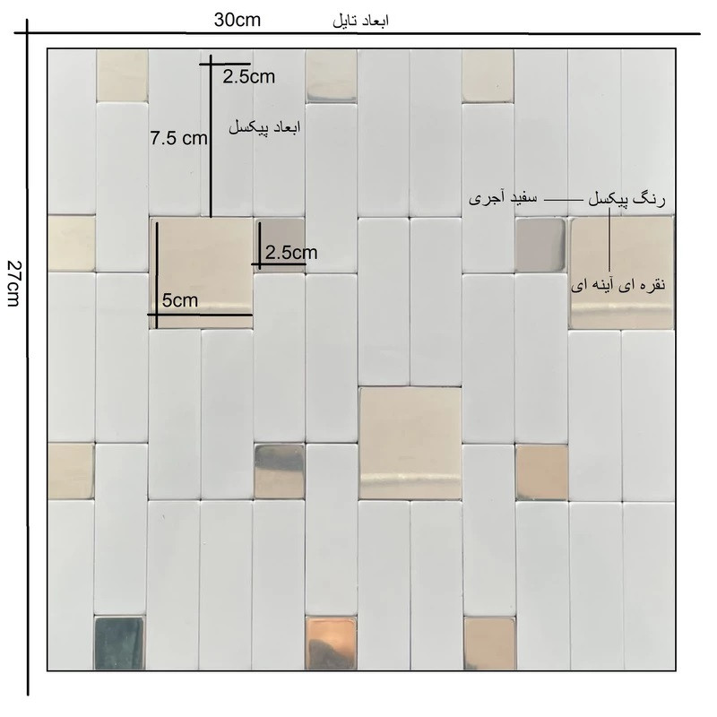 ابعاد و محاسبه مقدار مورد نیاز: مدل این محصول پازلی است و این محصول شامل 6 عدد تایل 27 در 30 سانتی متر یا همان 0.6 متر مربع است و پیکسل این محصول 2.5 در 2.5 و 5 در 5 سانتی متر است برای به دست آوردن متراژ دقیق طول را در ارتفاع آن ضرب کنید تا مترمربع را به دست آورید رنگ: رنگ محصولات به صورت ترکیبی است و کاملا همانند تصویر آن میباشد. رنگ دقیق پیکسل ها سفید آجری و نقره ای آینه ای است قدرت چسبندگی و استفاده: تایل بین کابینتی کامپوزیت آلمینیومی پشت چسبدار این محصول مخصوص استفاده برای بین کابینت و دیوار سرویس بهداشتی و آشپزخانه و… استفاده میشود. و جنس چسب این محصول آلمانی میباشد و از قدرت چسبندگی بسیار بالا و با دوام برخوردار است. مقاومت و تمیز کاری: بر اثر حرارت های پشت بخاری یا گاز آشپزخانه و…. کاملا ایمن و مقاوم است و همچنین قابلیت نظافت آسان دارد