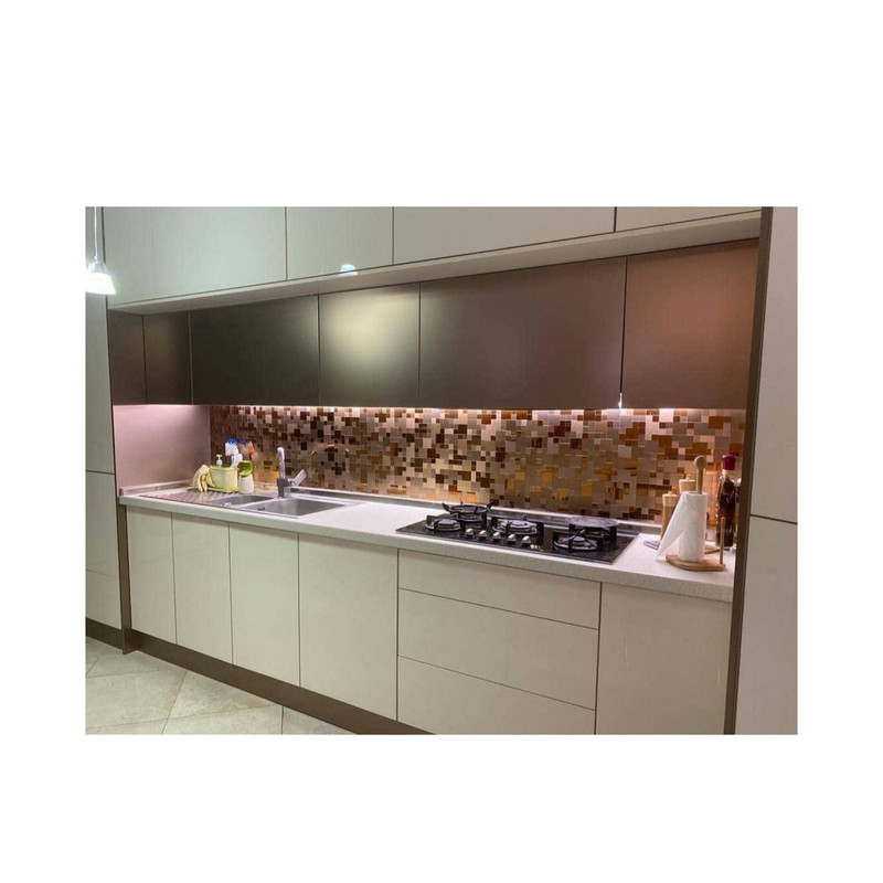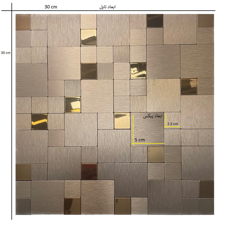 ابعاد و محاسبه مقدار مورد نیاز: مدل این محصول پازلی است و این محصول شامل 11 عدد تایل 30 در 30 سانتی متر یا همان 1 متر مربع است و پیکسل این محصول 2.5 در 2.5 و 5 در 5 و 1 در 1 سانتی متر است برای به دست آوردن متراژ دقیق طول را در ارتفاع آن ضرب کنید تا مترمربع را به دست آورید رنگ: رنگ محصولات به صورت ترکیبی است و کاملا همانند تصویر آن میباشد. رنگ دقیق پیکسل ها مسی روشن خشدار و مسی تیره خشدار و مسی آینه ای است قدرت چسبندگی و استفاده: تایل بین کابینتی کامپوزیت آلمینیومی پشت چسبدار این محصول مخصوص استفاده برای بین کابینت و دیوار سرویس بهداشتی و آشپزخانه و… استفاده میشود. و جنس چسب این محصول آلمانی میباشد و از قدرت چسبندگی بسیار بالا و با دوام برخوردار است. مقاومت و تمیز کاری: بر اثر حرارت های پشت بخاری یا گاز آشپزخانه و…. کاملا ایمن و مقاوم است و همچنین قابلیت نظافت آسان دارد