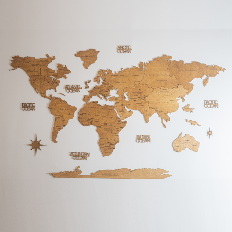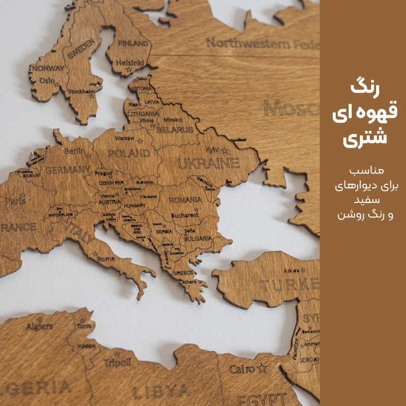 نقشه چوبی جهان ساخته شده از بهترین ورق چوب پلای وود که با استفاده از دقیق ترین دستگاه های برش و حکاکی تولید شده است.تفاوت این محصول با نمونه های مشابه : طراحی اختصاصی با نمونه برداری از مدل مشابه اروپایی، کیفیت بالای ساخت، استفاده از چوب طبیعی به جای ام دی اف های بی کیفیت، بسته بندی کارتنی جذاب و مطمئن با استفاده از ورق های ام دی اف میانی برای جلوگیری از شکستگی، داشتن کاتالوگ راهنمای جامع نصب به صورت تصویری و همچنین دارا بودن چسب ژله ای آلمانی و تجهیزات لازم برای نصب آسان و امن، می باشد. این محصول یکی از ترندهای دکوراتیو در اروپا و آمریکا بوده و برای همه نوع سلیقه ای مناسب است. نصب این محصول روی دیوار بسیار آسان و لذت بخش بوده و شما می توانید با استفاده از کاتالوگ راهنمای موجود در جعبه، به صورت گام به گام این محصول را نصب کنید.همچنین شما می توانید با استفاده از این نقشه کاربردی علاوه بر زیبایی محیط زندگی و کار خود، موقعیت جغرافیایی کشورها و دریاها و اقیانوس ها را نیز به عزیزان خود آموزش دهید. ما در ساخت این محصول تلاش کرده ایم تا حس کیفیت و لذت استفاده از یک محصول سفارشی را به مشتری خود منتقل کنیم. ساخت این محصول با استفاده از دقیق ترین دستگاه های برش و حکاکی انجام گرفته است و رنگ مورد استفاده روی چوب، رنگ گیاهی بوده و دارای استاندارد ضد حساسیت و آنتی باکتریال می باشد. این محصول هدیه ای منحصر به فرد و کاربردی برای دوستان و عزیزان شما بوده و می تواند خاطرات بهترین سفرهای شما را در خود جای دهد. این نقشه قابلیت نصب روی دیوار اتاق کار ، اتاق خواب ، اتاق نشیمن ، فضای پذیرایی و حال و دیوار شرکت و موسسه و سازمان شما را دارد.