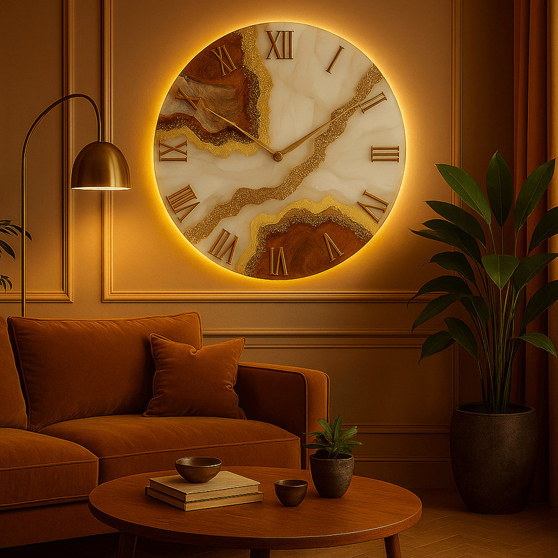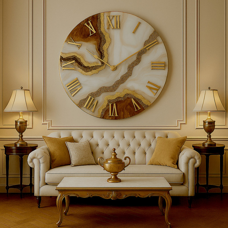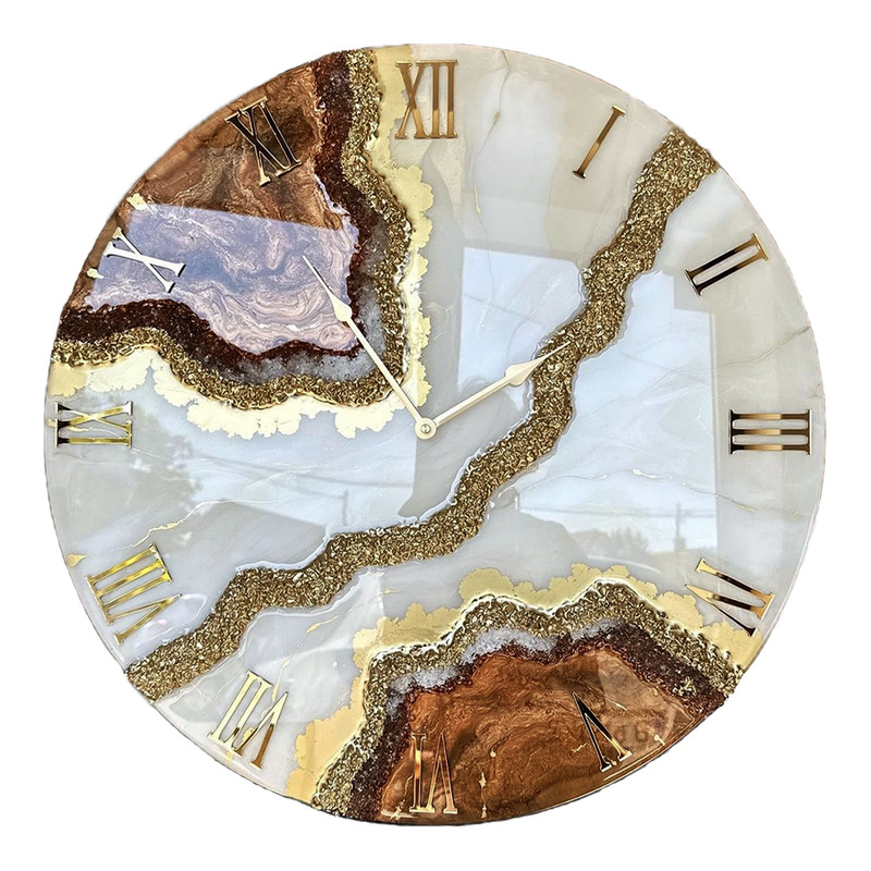 صفحه ساعت از رزین اپوکسی با کیفیت بالا ساخته شده که علاوه بر زیبایی، دوام و مقاومت قابل توجهی دارد. وجود شکستهای رنگی شبیه به سنگ طبیعی و ترکیب هنرمندانه رنگهای طلایی، مسی و بژ، این ساعت را به یک قطعه هنری دیواری تبدیل کرده است.