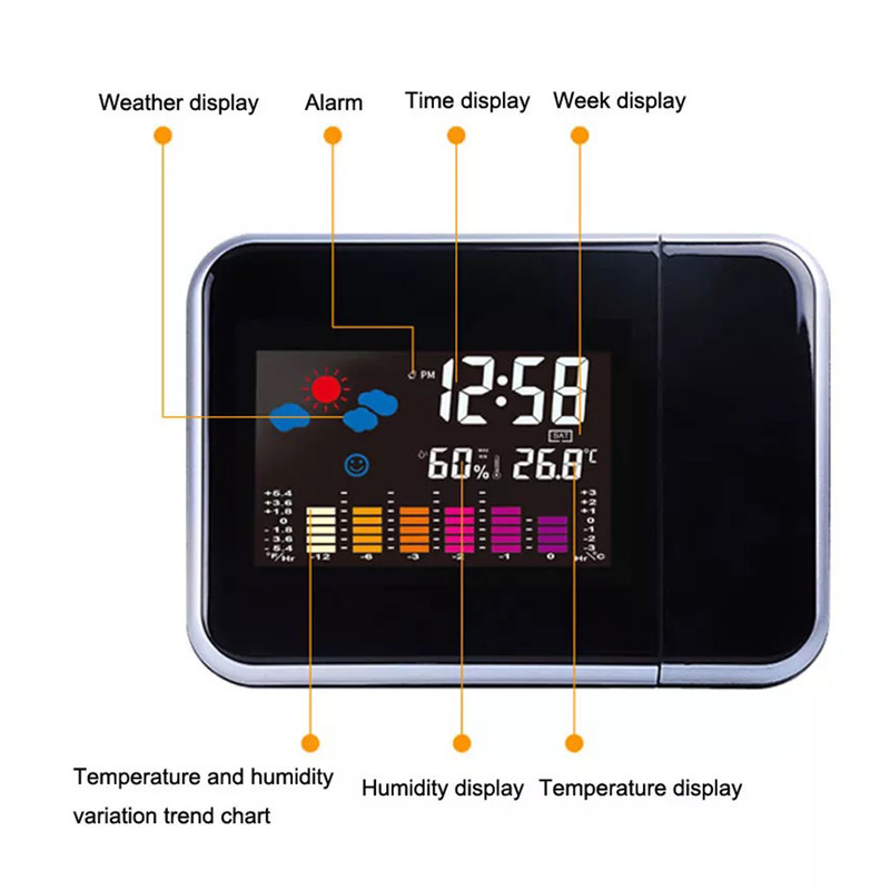 با قابلیت نمایش ساعت روی سقف یا دیوار به همراه تقویم و دماسنج و رطوبت سنج و ساعت زنگدار میباشد. |