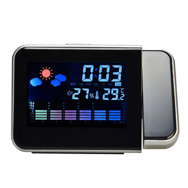 ساعت پروژکتوری رومیزی دارای قابلیت های نمایش ساعت روی سقف یا دیوار ، نمایشگر وضعیت آب و هوا (ابری ، آفتابی،..) به همراه تقویم و دماسنج و رطوبت سنج و ساعت زنگدار می باشد. ساعت دیجیتال پروژکتوری رومیزی مدل DS-8190 با قابلیت نمایش ساعت روی سقف یا دیوار به همراه تقویم و دماسنج و رطوبت سنج و ساعت زنگدار میباشد. با داشتن این ساعت زمانی که شما نیمه شب از خواب نازتان بیدار می شوید با فشار دادن دکمه بالای ساعت چراغ صفحه نمایش به همراه ساعت پروژکتوری بر روی سقف یا دیوارروشن میشود. همچنین با دکمه ولومی تعبیه شده شما می توانید به نسبت فاصله مانع ( دیوار یا سقف ) وضوح تصویر منعکس شده را تنظیم کنید تا واضح ترین ساعت را بصورت سینمایی ببینید و حالت چرخشی بخش پروکتور به شما کمک می کند تا زاویه تابش را به دلخواه تعیین کنید . قابلیت نمایش ساعت بصورت پروجکشن شده عین پرده سینما روی دیوار یا سقف را دارد. دارای محفظه پروژکتور با قابلیت تغییر زاویه تابش روی دیوار یا سقف را دارد. دارای صفحه نمایش LCDمی باشد. دارای دماسنج دیجیتالی از 9.9- الی +60 درجه سانتیگراد و دارای رطوبت سنج دیجیتالی از 20 الی 90 درصد می باشد. امکان تغییر نمایش دما در واحد سانتیگراد یا فارنهایت را دارد. برد پروژکتور حدود 1.5 الی 2 متر در فضای تاریک را دارد که هر چه فضا و محیط تاریکتر فاصله بیشتری را نمایش می دهد. نیروی برق مورد نیاز 2 عدد باتری نیم قلمی AAA یا ورودی برق 5 ولت (نیاز به آداپتور 5 ولتی که در بسته بندی موجود نمیباشد) را دارد.