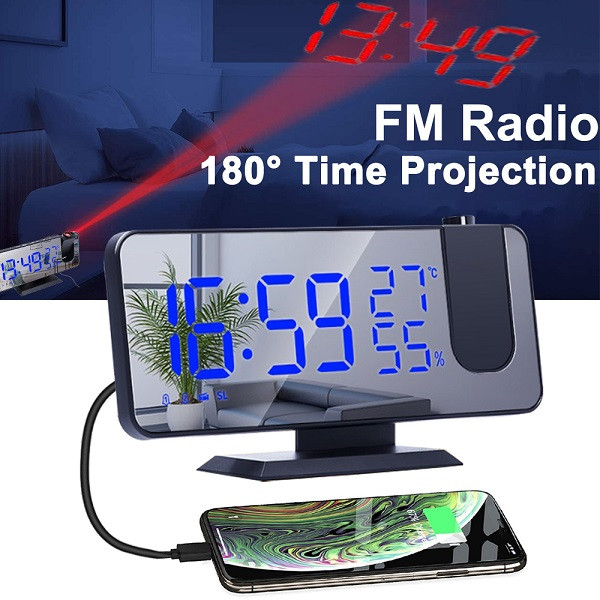 EN8827 ساعت نمایشگر آینه ای LED ساعت زنگ دار دیجیتالی پروژکتور رادیویی FM با نمایشگر رطوبت دما – سیاه/سفید