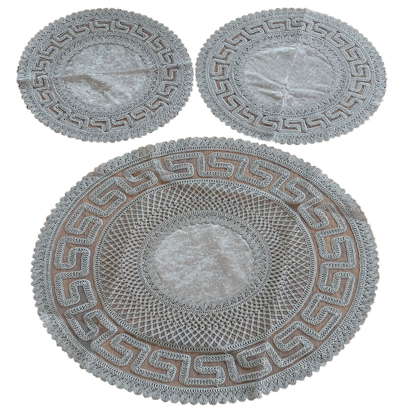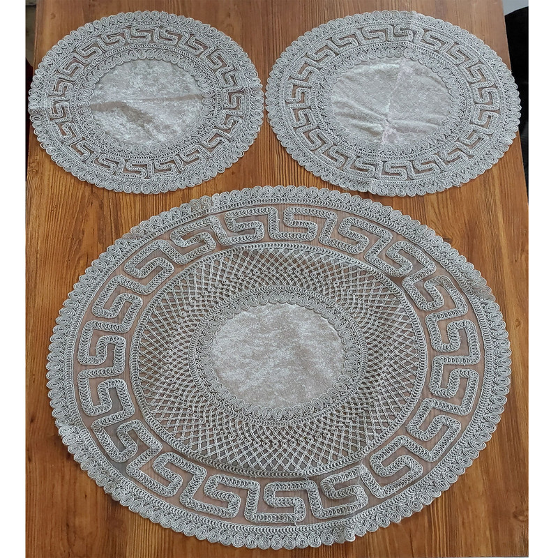 ست رومیزی 3 تکه شامل:یک عدد جلو مبلی دایره به قطر 60 سانتی متر و 2 عدد رو میزی عسلی دایره به قطر 37 سانتی متر می باشد. |