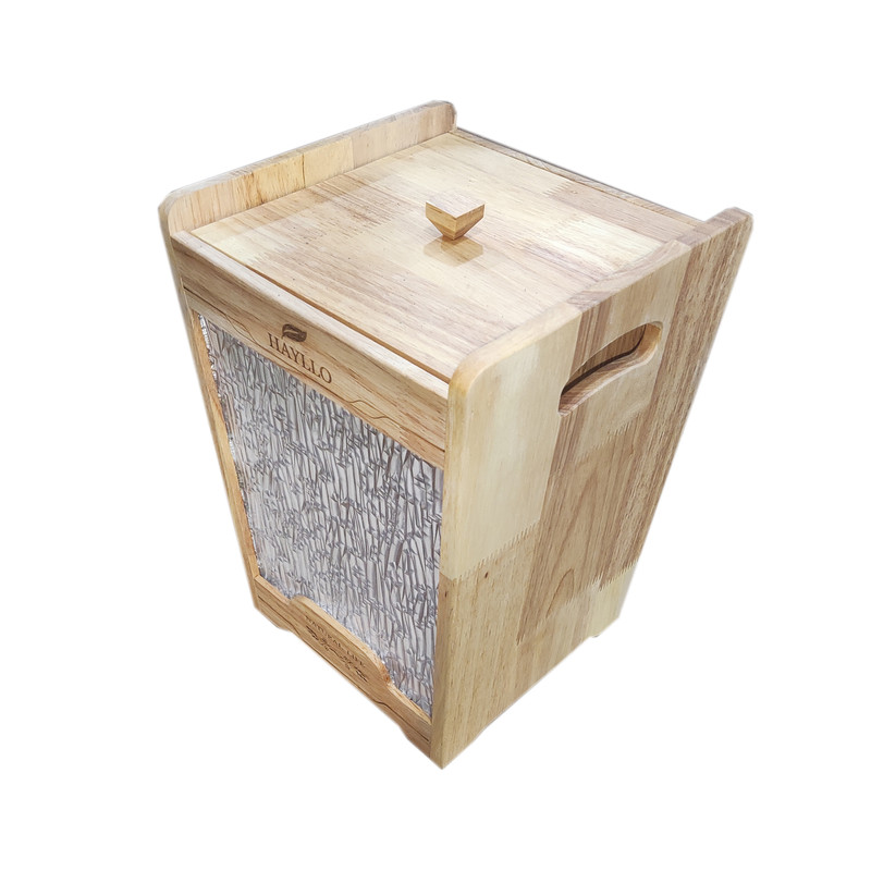 نمای جلویی سطل با شیشه‌ی مات تزئین شده که علاوه‌بر زیبایی بصری، جلوه‌ای خاص و متفاوت به محصول داده و آن را از نمونه‌های معمولی متمایز می‌کند. ترکیب چوب با بافت طبیعی و شیشه مات، حس ظرافت و اصالت را به‌خوبی منتقل می‌کند.