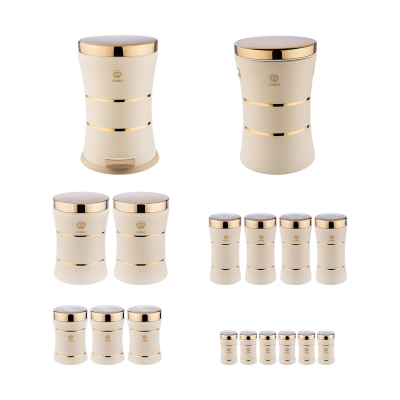 این سرویس شامل: سطل زباله ۱عدد سطل برنج ۱ عدد سطل قند ۱عدد سطل شکر ۱عدد بانکه حبوبات ۴عدد پاسماوری ۳عدد جای ادویه ۶عدد