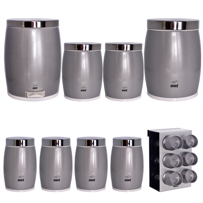 این ست شامل : 1 عدد سطل زباله ، 1 عدد سطل برنج ، 1 عدد سطل قند ، 1 عدد سطل شکر، 4 عدد جا حبوبات ، جا ادویه 6 پارچه همراه استند