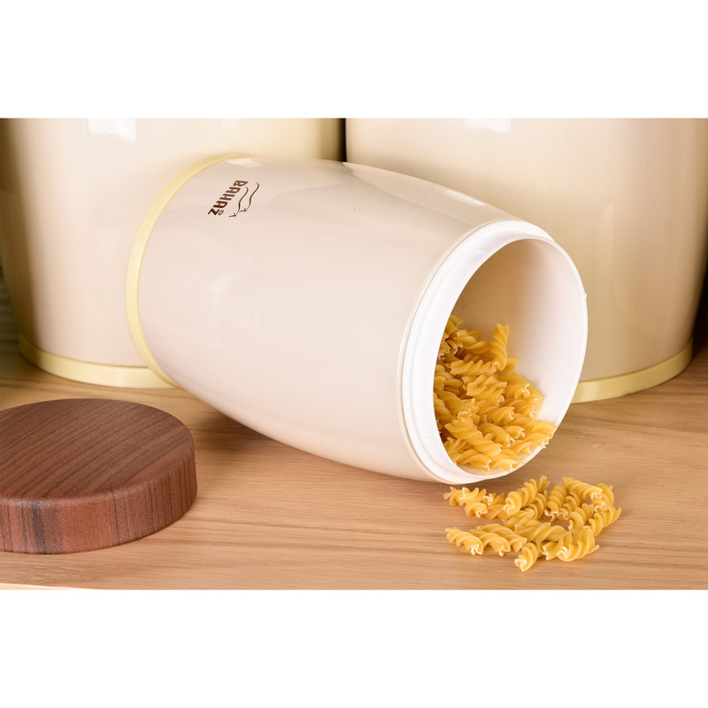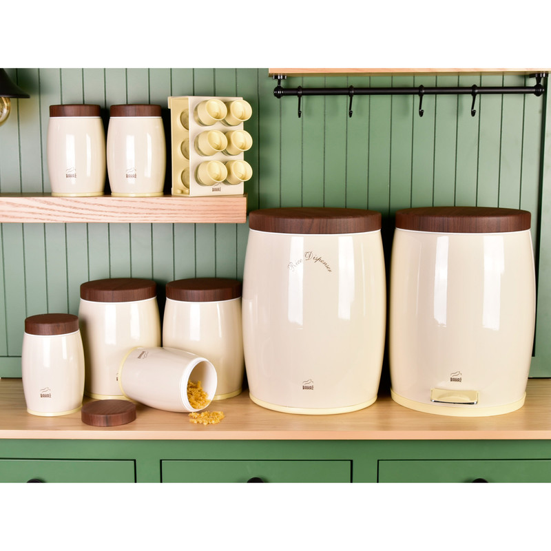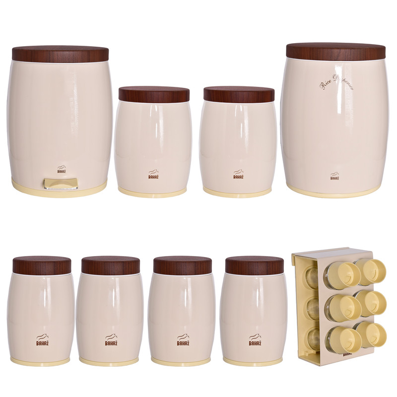 این ست شامل : 1 عدد سطل زباله ، 1 عدد سطل برنج ، 1 عدد سطل قند ، 1 عدد سطل شکر، 4 عدد جا حبوبات ، جا ادویه 6 پارچه همراه استند