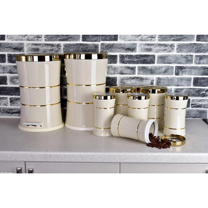 سرویس آشپزخانه 8 پارچه از جنس فلز ضد زنگ شامل قوطی های بسیار با کیفیتی است که در اندازه های مختلف تولید شده اند. میتوانید از این قوطی ها برای نگهداری حبوبات، برنج، قند و شکر و … استفاده کنید. همچنین این سرویس دارای یک سطل زباله بزرگ می باشد که از یک بدنه فلزی و یک سطل داخلی قابل جدا شدن از جنس پلاستیک تشکیل شده تا شستشو ی آن آسان باشد. سطل داخلی دارای یک دسته استیل است و به راحتی بیرون می آید. برای باز کردن درب این سطل یک پدال در نظر گرفته شده و درب آن به صورت آرام بسته می شود. این سرویس شامل: سطل زباله ، سطل برنج ، 2عدد سطل بزرگ قند و شکر ، 4 عدد بانکه 1.5کیلویی حبوبات می باشد.