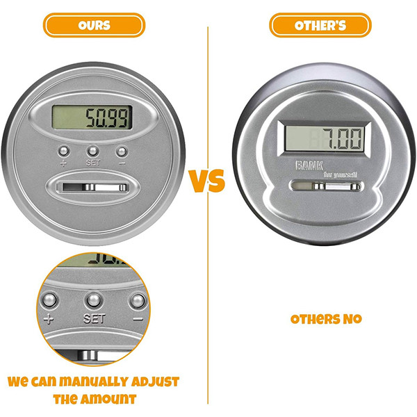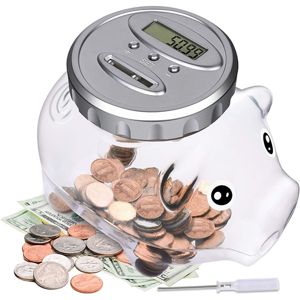 صفحه نمایش LCD شفاف، Piggy bank تمام سکه های ایالات متحده از جمله: پنی، نیکل، سکه، ربع، نیم دلار و سکه دلار را می پذیرد. صفحه LCD شفاف، سکه های شما را می شمارد و کل مبلغ را برای هر سپرده دقیقاً نشان می دهد. تغذیه توسط یک باتری 2 x AA (شامل نمی شود).