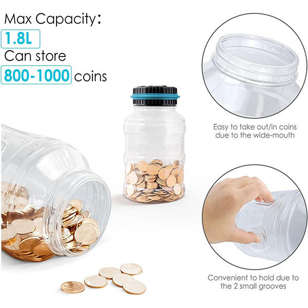 (طراحی شده برای همه سکه های ایالات متحده) ظرفیت بزرگ تا 1.8 لیتر، ظرف شمارش دیجیتالی پول می تواند 800-1000 سکه را ذخیره کند. بانک شمارش دیجیتال سکه تمام سکه های ایالات متحده را می پذیرد و با 2 باتری AAA (شامل نمی شود) تغذیه می شود.