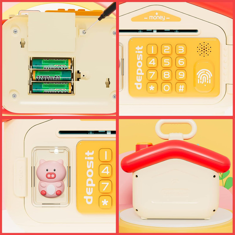 5 آهنگ و 19 ساز و صدای 7 تا از حیوانات به همراه 54 تا اسم متفاوت انگلیسی و قابلیت امکان تنظیم رمز برای قفل ماندن قلک |