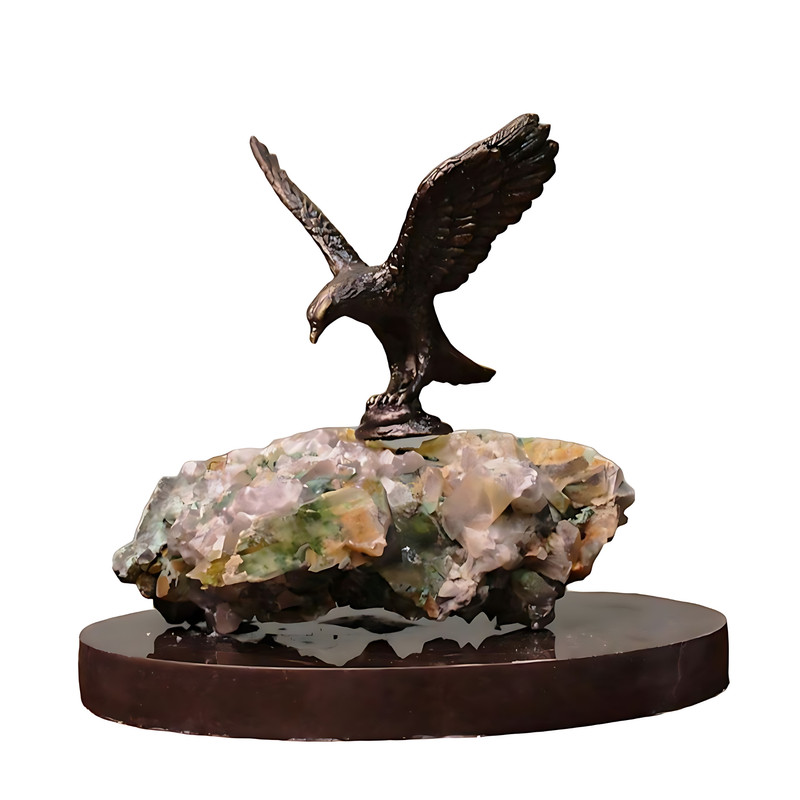 مجسمه برنزی عقاب، تلفیقی شگفتانگیز از هنر فلزکاری و زیبایی طبیعت است که بر روی سنگ کلکسیونی طبیعی سوار شده و جلوهای چشمگیر به هر فضای داخلی میبخشد. این مجسمه با دقت بالا و جزئیات ظریف بهصورت کاملاً دستساز از برنز مرغوب ساخته شده و نمایانگر قدرت، بینش، شجاعت و پرواز بهسوی اهداف بلند است.
