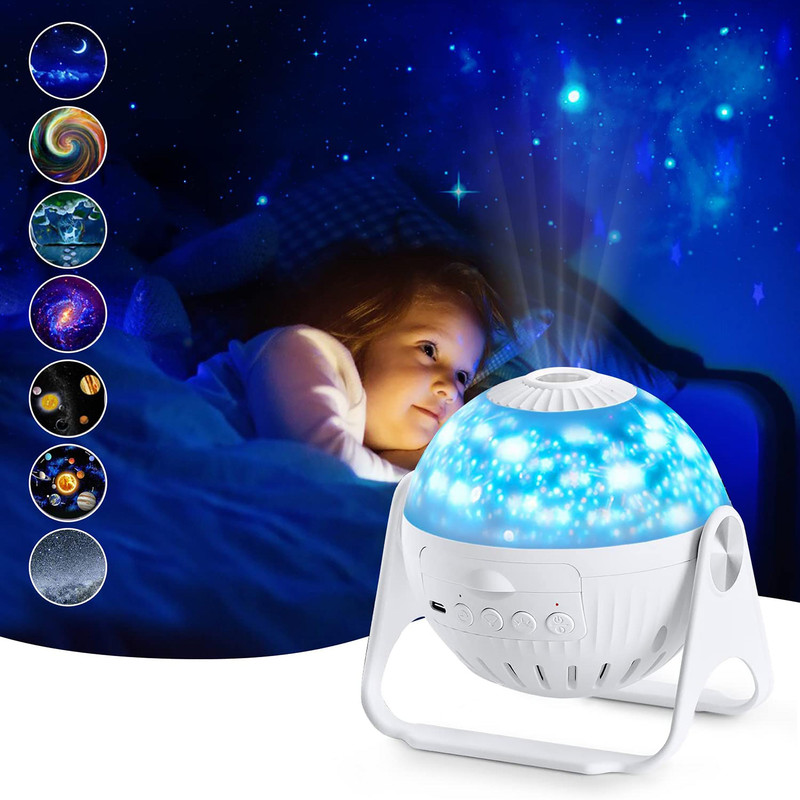 چراغ خواب سه بعدی کهکشانی دارای 6 حالت نورپردازی از کهکشان راه شیری، سیارات، ماه، سحابیها و شفق قطبی است. فوکوس 360 درجه، کیفیت تصویر HD، استفادهی آسان و نداشتن صدای اضافه از دیگر ویژگیهای این چراغ خواب سه بعدی است.