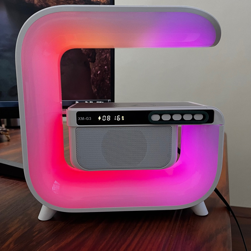 چراغ خواب هوشمند RGB مدل XM-G3 طرح اسپیکر دار ، یک گجت چندکاره است که علاوه بر یک چراغ خواب جذاب با افکت های نوری RGB ، قابلیت نمایش ساعت و تنظیم ساعت بیدار شدن و کوک کردن ساعت و همچنین قابلیت شارژ کردن وایرلس موبایل را دارد . از قابلیت جذاب دیگه این محصول که آن را خاص میکند ، اسپیکر های این چراغ خواب است که میتوانید قبل از خواب موزیک دلخواه خودتون رو از طریق بلوتوث پخش کنید. برای تنظیم ساعت این دستگاه کافیه یکبار به یک تلفن همراه (از طریق بلوتوث) متصل کنید تا ساعت دستگاه تنظیم شود . این دستگاه برای روشن شدن نیاز به آداپتور 20 وات دارد که میتوانید از آداپتور های موبایل این وسیله را شارژ و یا روشن کنید.