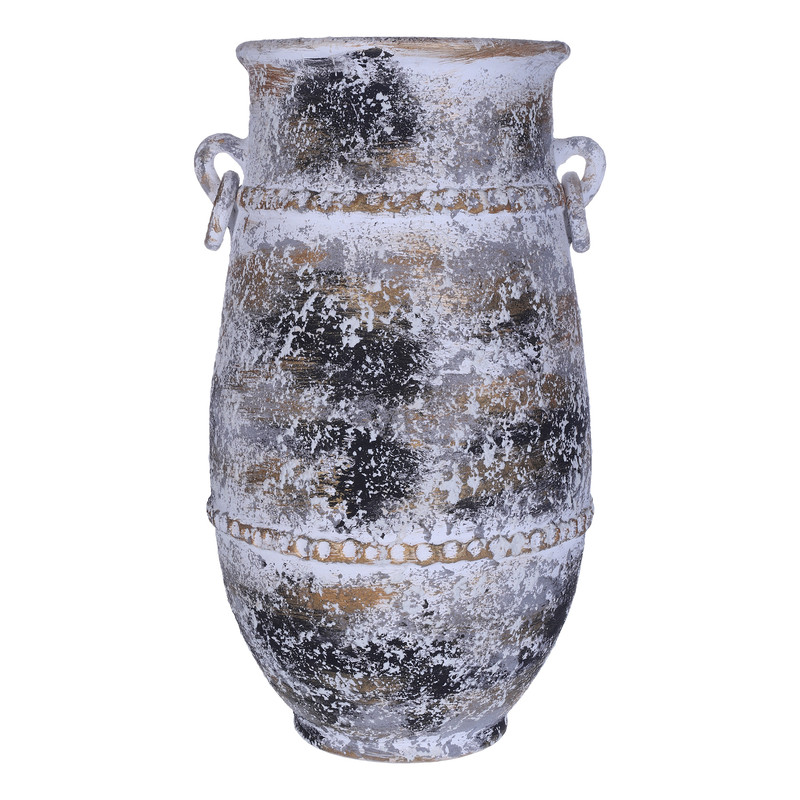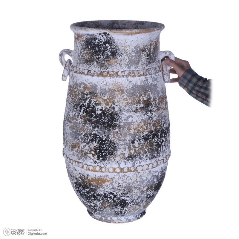 این گلدان ظاهری روستیک و آنتیک دارد و با طرح و رنگ‌آمیزی کهنه‌نما (Distressed) ساخته شده است. متریال آن معمولاً از سفال است،و رنگ‌های قهوه‌ای، مشکی و سفید به‌صورت لایه‌لایه و نامنظم روی آن کار شده‌اند تا حس قدیمی و دست‌ساز بودن را القا کند.