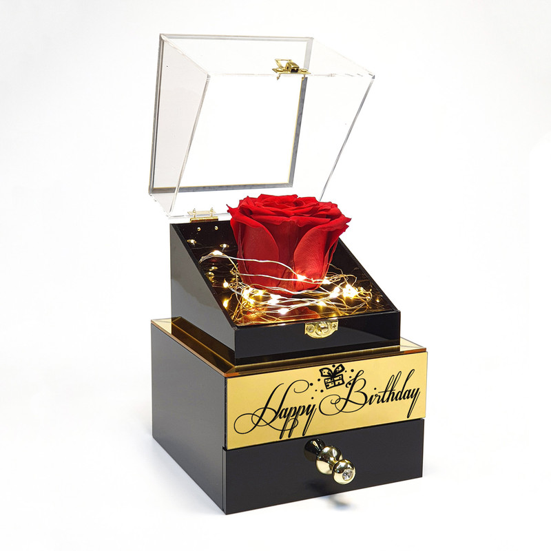 متریال این جعبه گل رز جاودان از جنس پلکسی می باشد، قسمت بالا جنس از آکرلیک شفاف و در قسمت پایین از پلکسی به رنگ مشکی یا سفید براق هست که شما میتوانید طبق سلیقه و پسند خودتون هر یک رو تهیه کنید. این جعبه در قسمت پایین دارای یک کشو برای قرار دادن هدایای کوچک مثل ساعت، سکه، پول، قطعه ای طلا و… مناسب می باشد، قسمت بالای کشو دارای پلاک طلایی با متن تولد ( Happy Birthday ) می باشد.