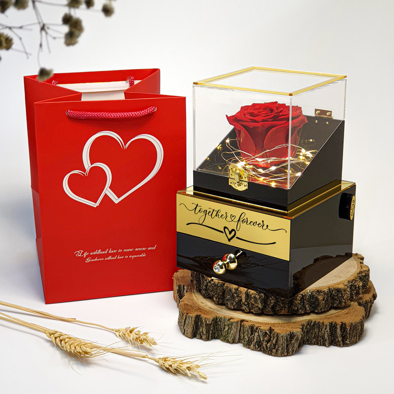 متریال این جعبه گل رز جاودان از جنس پلکسی می باشد، قسمت بالا جنس از آکرلیک شفاف و در قسمت پایین از پلکسی به رنگ مشکی یا سفید براق هست که شما میتوانید طبق سلیقه و پسند خودتون هر یک رو تهیه کنید. این جعبه در قسمت پایین دارای یک کشو برای قرار دادن هدایای کوچک مثل ساعت، سکه، پول، قطعه ای طلا و… مناسب می باشد، قسمت بالاس کشو دارای پلاک طلایی با متن ( Together ❤️ Forever ) هست.