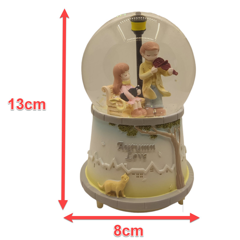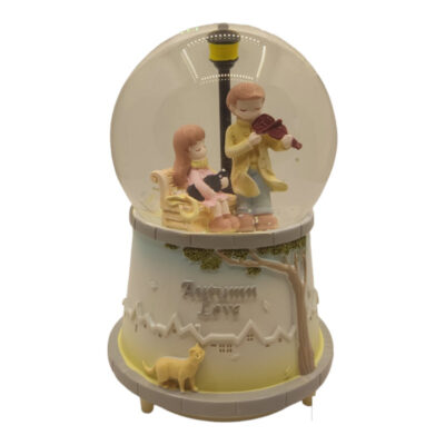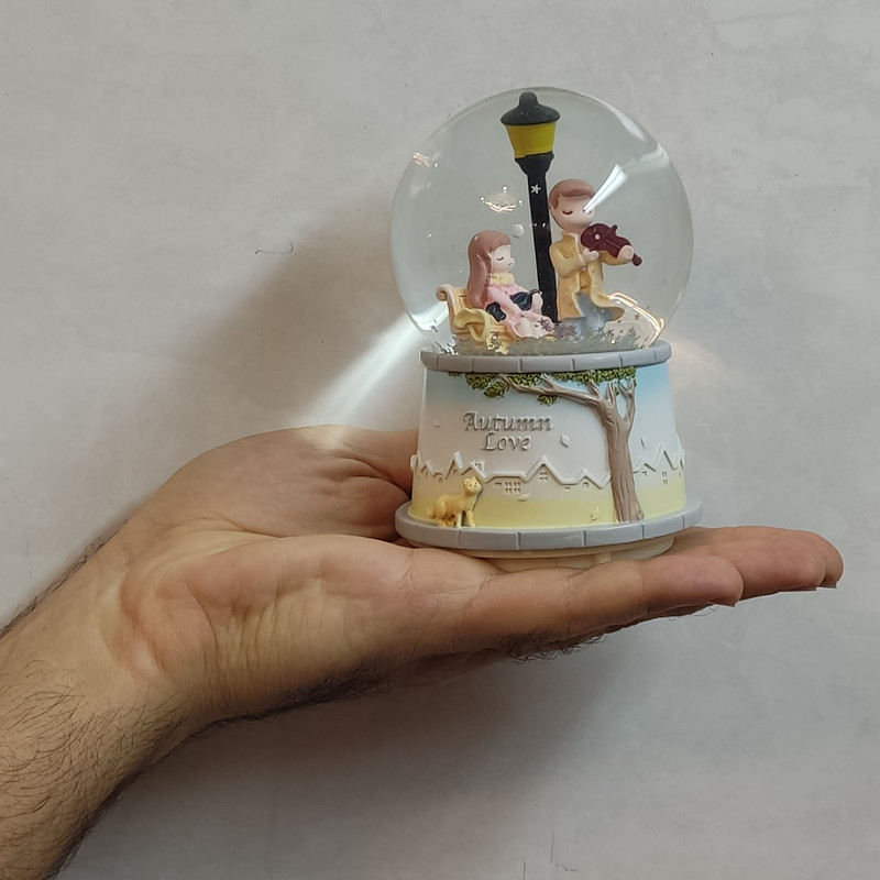 گوی موزیکال چراغ دار طرح دیدار عاشقانه پاییزی می تواند یک هدیه بسیار خاص و جذاب برای عزیزان شما باشد همچنین یادگاری به یاد ماندنی و مناسب جهت هدیه تولد و یا سایر مناسبت ها است. این گوی موزیکال توسط باتری نیم قلم شروع به نواختن آهنگ های بی کلام میکند که در نوع خود بسیار دلنشین و جذاب است و هم زمان داخل گوی با چراغ های رنگی متفاوت روشن میشود.اندازه، جنس، کیفیت و نوع گوی های موزیکال موجود در بازار بسیار متفاوت است. جهت انتخاب به اندازه گوی، چراغ های رنگی داشتن و کیفیت پایه دقت کنید. این گوی موزیکال دارای پایه محکم و سنگین ساخته شده از جنس رزین توپر است و کیفیت رنگ آن نیز بسیار بالا است.